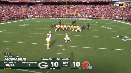 After the Browns tied the game with just over three minutes left in regulation, the Packers quickly moved into scoring position. A defensive pass interference pushed the offense past midfield, and Love then connected with tight end Tucker Kraft for 18 more yards to move just outside the red zone. The offense stalled at that point, with Jacobs nearly fumbling away the ball and the ground game grinding to a halt as detailed above. Still, Green Bay had a chance for a go-ahead field goal with less than 30 seconds left.
