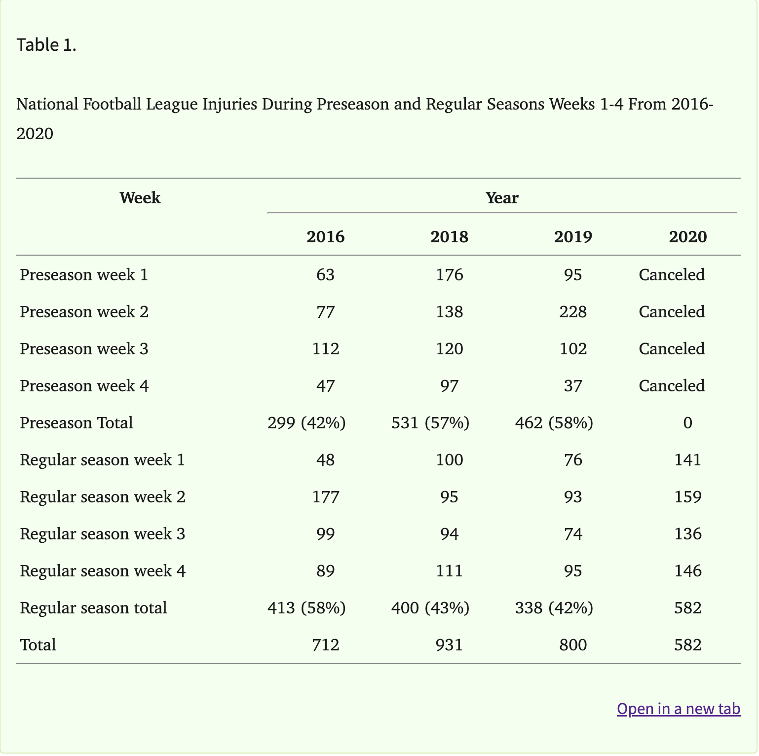 Another study, this one published in Arthroscopy, Sports Medicine, and Rehabilitation (ASMAR), compared injury histories from 2016, 2018, and 2019 with the 2020 regular season, and the results were staggering. The COVID season saw 141 injuries in Week 1, 41 more than in the worst non-COVID seasons. Similar, though less stark, outcomes were found in Weeks 3 and 4.