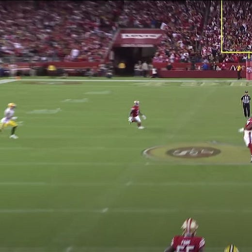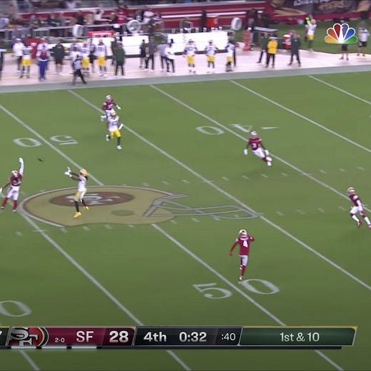 Even the staple concepts LaFleur did call took on a different look against San Francisco. Green Bay often runs a passing play called "Heat," a deep curl that pulls down the safety and a deep post over the top to exploit the vacated space. In its traditional form, Heat uses play-action to draw in the linebackers and clear out space around the curl. However, LaFleur ran the play out of empty to trick the defense into expecting another quick throw. Despite the 49ers playing a quarters coverage that should have prevented an explosive gain, Rodgers connected with Marquez Valdes-Scantling for the longest completion of the night.