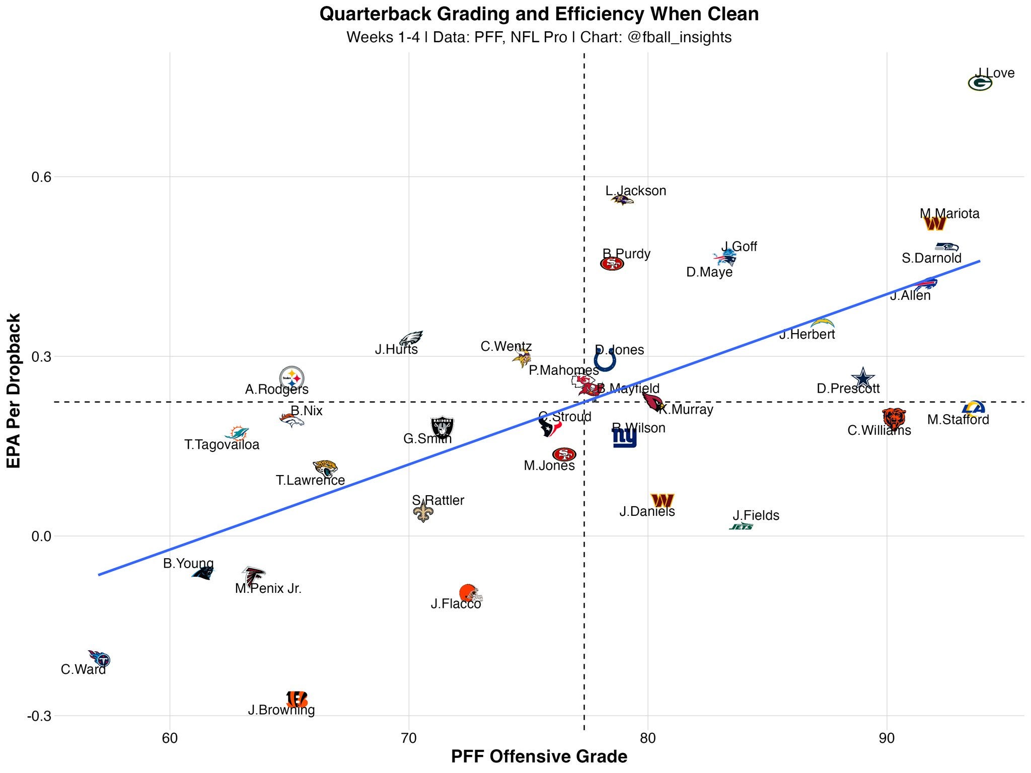 The Jordan Love evolution cannot be understated, even from those of us who insisted last year’s relative lack of growth stemmed more from injury than stagnation. Love has taken an enormous leap forward in accuracy and decision-making. Performance in a clean pocket is one of the most stable QB metrics, and Love has been the single best player from a clean pocket in the world through a month of the season.