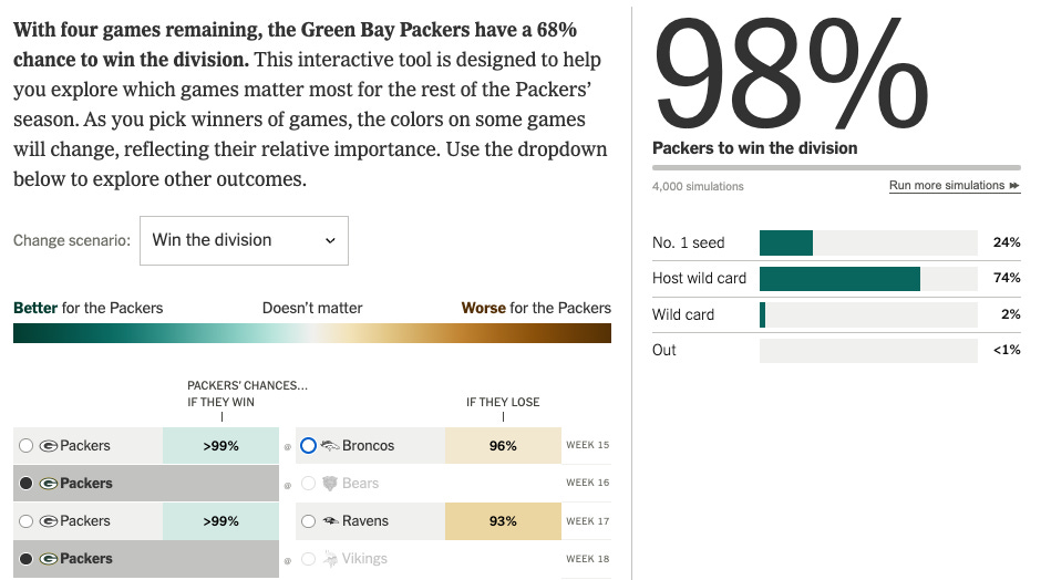 Sunday’s victory didn’t seal the division for the Packers, but it put them comfortably in the driver’s seat. With an upcoming schedule that includes another matchup with Chicago and a regular-season finale against the Minnesota Vikings, they wouldn’t necessarily need to win either of their other matchups to take the NFC North, according to The Athletic’s NFL playoff simulator.